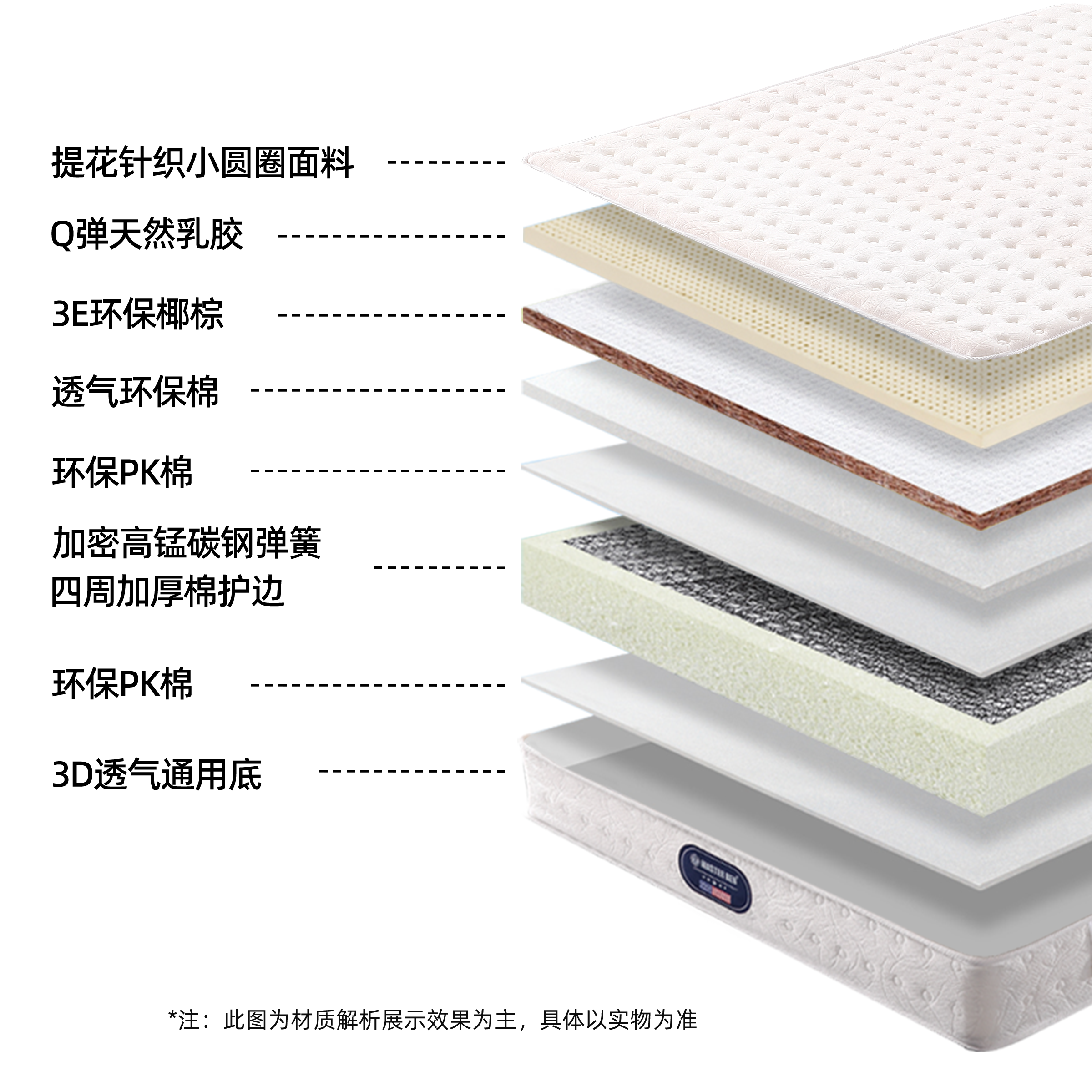 (提花针织小圆圈面料+天然乳胶+3E环保椰棕+加密高锰碳钢弹簧+棉毡打底)