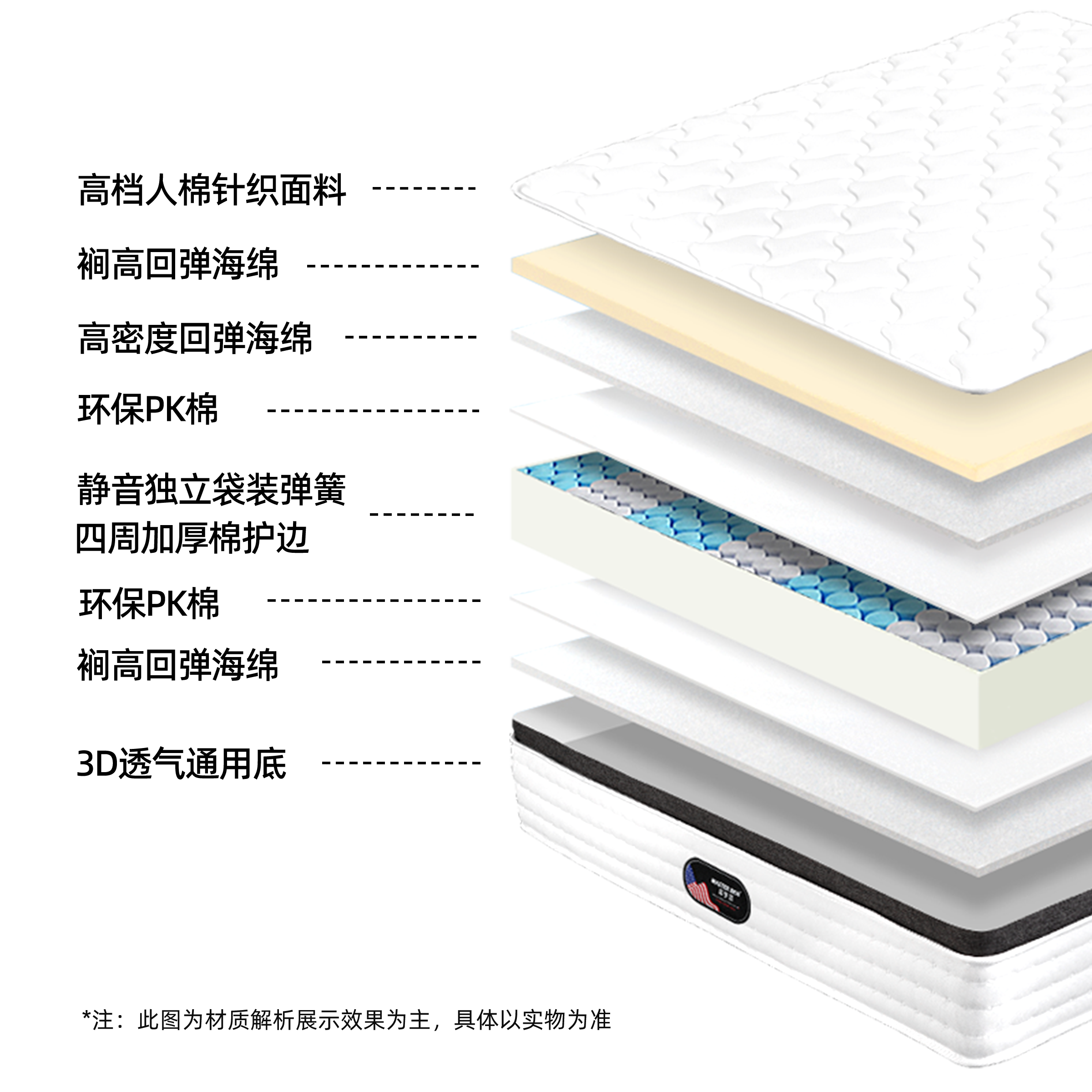 | YD03 | 180*200cm | 美金邦-偏软 | 高档天丝针织面料+高密度海绵+独立袋装弹簧 |