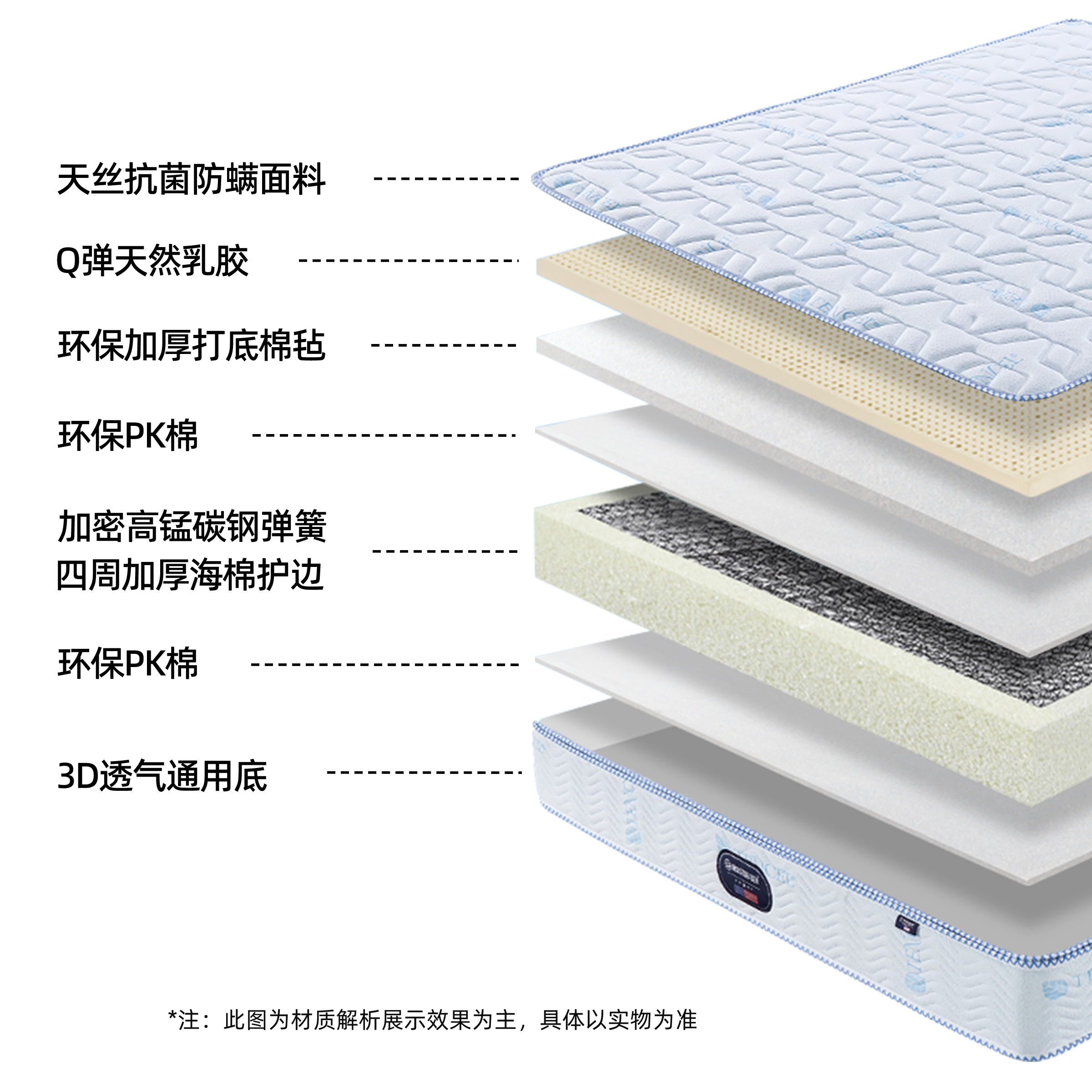 | A651 | 180*200cm | 美金邦-养生 | 舒柔天丝抗菌防螨面料+天然乳胶+高回弹海绵+加密高锰碳钢弹簧 |