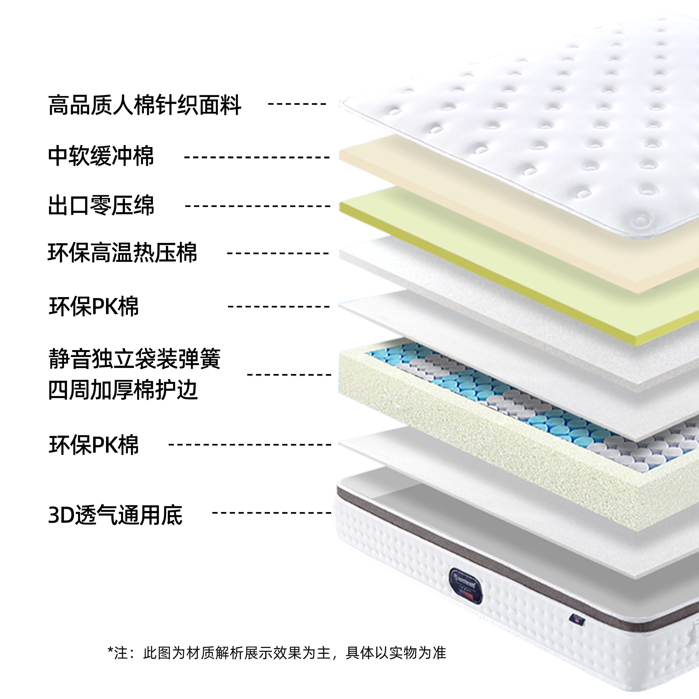 | A658 | 180*200cm | 美金邦-偏软 | 人棉针织面料+零压棉+缓冲棉+独立袋装弹簧 |