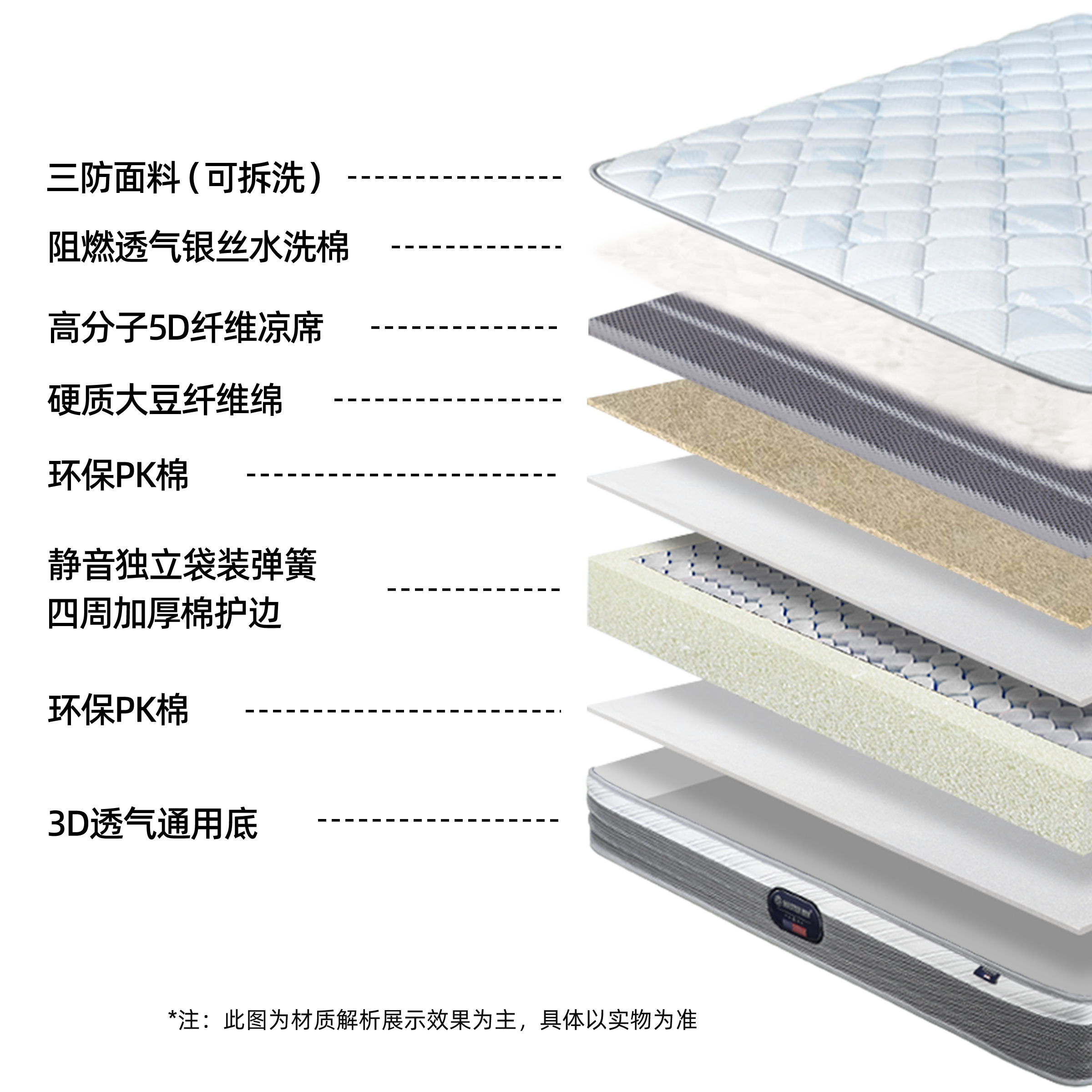 | A1114 | 180*200cm | 老年保健 | 三防面料裥银丝水洗棉面料+高分子5D纤维凉席+大豆纤维硬质棉+独立袋装弹簧 |